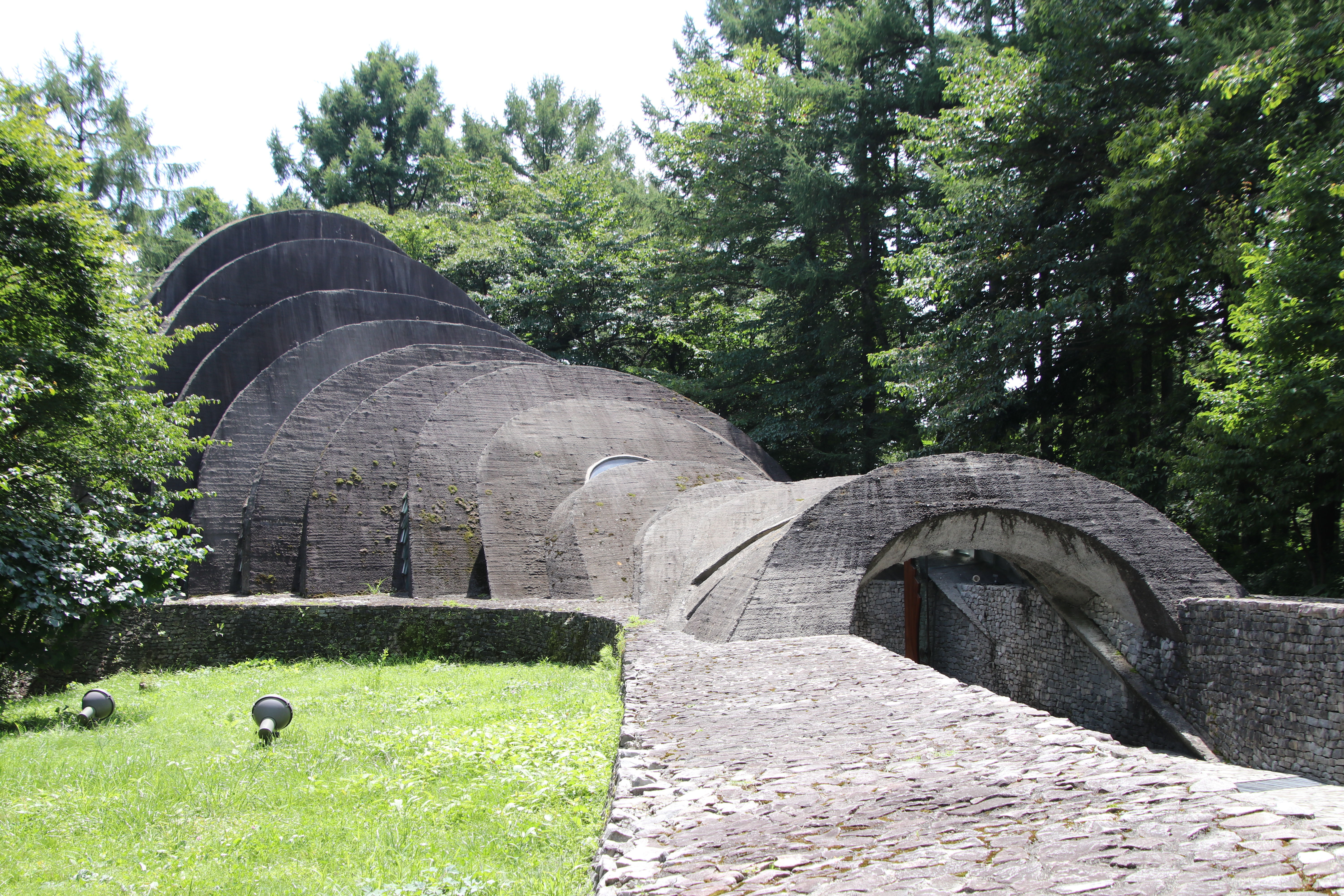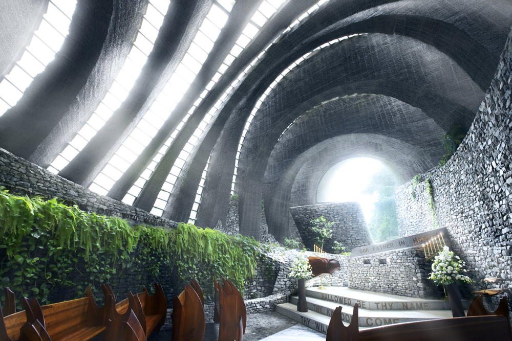 建築師根據其思想 將石 光 水 綠 樹五大自然元素融入在這座身兼紀念館的教堂之中