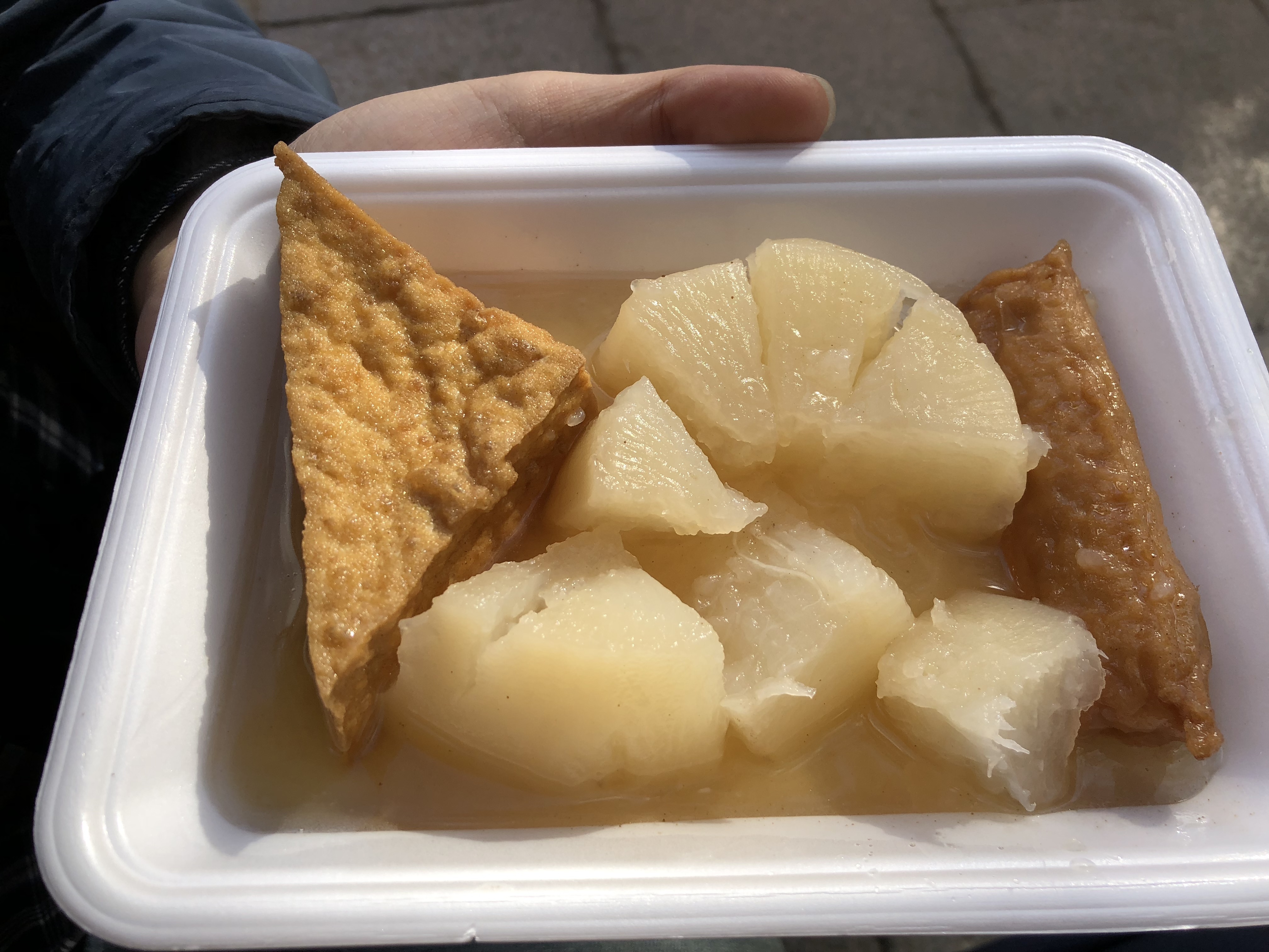 有些比較勤勞的攤販一大早就開始在做生意了,清爽的冬日早晨吃著大根蘿蔔甜不辣,暖心又暖胃。