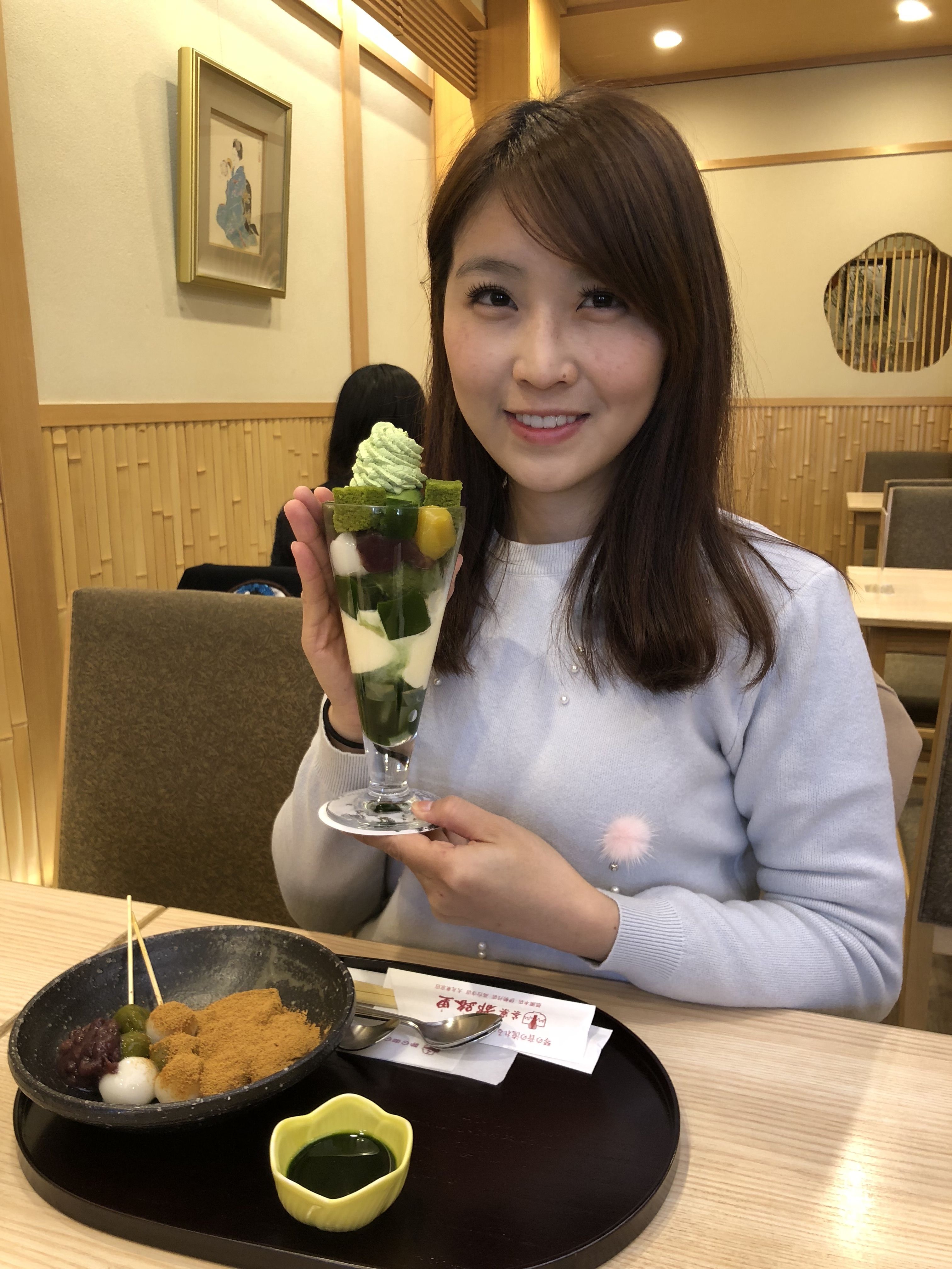 兩人點了招牌的抹茶聖代搭配白玉蕨餅,一邊品嘗美食一邊享受悠閒的時光。